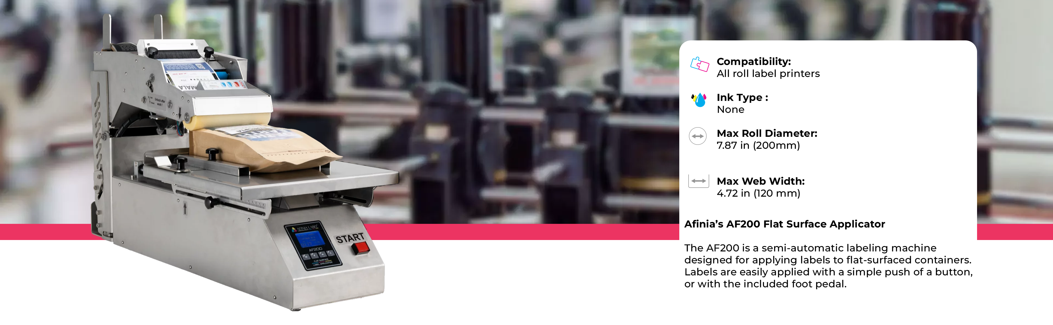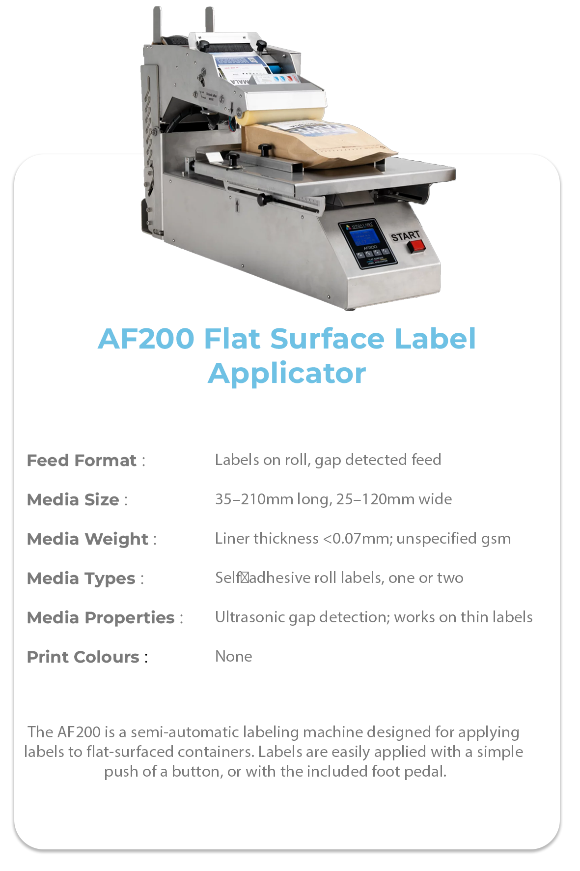 The AF200 is a semi-automatic labeling machine designed for applying labels to flat-surfaced containers. Labels are easily applied with a simple push of a button, or with the included foot pedal.