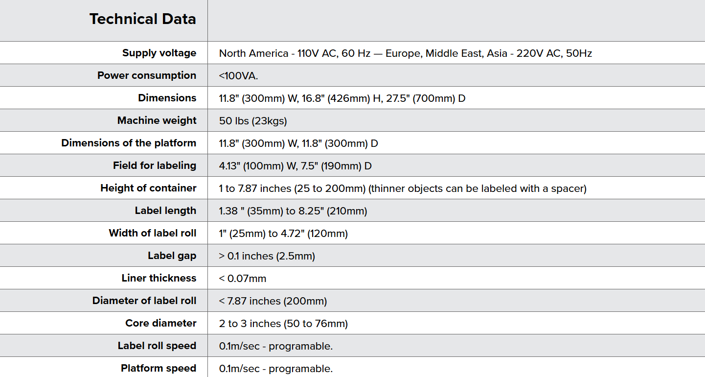 Media Size | Label length: 35–210 mm; width: 25–120 mm; container field: 100×190 mm; height: 25–200 mm |